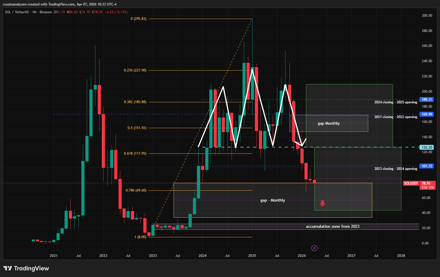 Solana price enters a critical gap zone as bearish structure develops. Key levels, Fibonacci analysis, and downside targets explained.