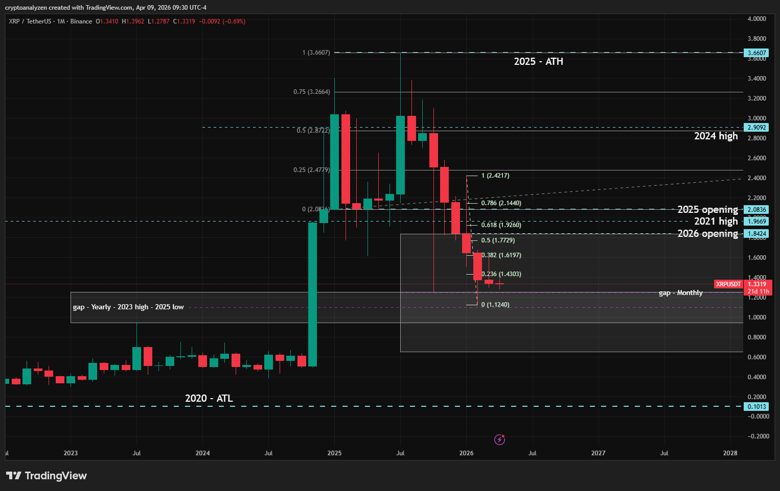 XRP technical analysis across 3M and monthly charts shows increasing downside risk toward $0.94 and possibly $0.64. Full breakdown of key levels and scenarios.